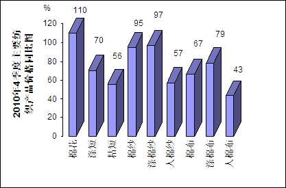 不但與2009年同比價格漲幅巨大,而且2010年4季度與3季度環比,主要紡織產品價格也提高明顯,均在20%以上,特別是滌綸短纖和粘膠短纖價格提高都在50%以上(如圖)。
