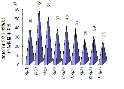 從上圖中可以清楚地看出,2010年4季度與3季度環比,主要紡織原料及紗、布價格均有大幅提高,其中滌短價格最高時上漲了59%,其次是粘短價格,最高時也上漲了51%。其它如棉花、棉紗、滌棉紗、人棉紗漲幅在30%以上,棉布、滌棉布及人棉布等價格環比漲幅在20%以上。