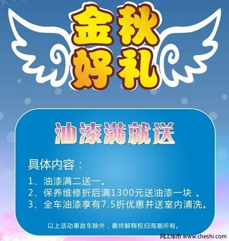 近日,從紹興海潮北京現代4S店了解到,為回饋廣大新老客戶,紹興海潮現開展“金秋好禮,油漆滿就送”活動。凡是活動期間,來店保養維修客戶,折后滿1300元送油漆一塊!具體活動內容如下: