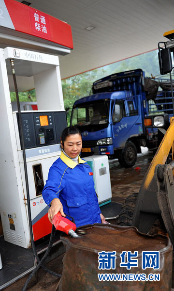 10月27日,在湖北宣恩縣一實行柴油限量供應的加油站,工作人員在往油桶里裝油。