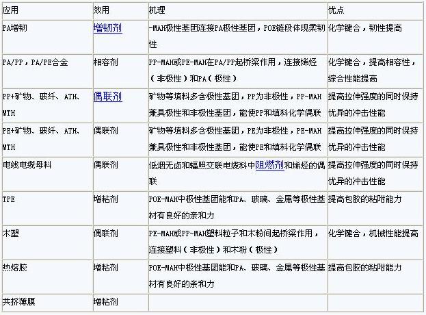 由于馬來酸酐接枝物中兼具馬來酸酐提供的極性基團醛基和烯烴非極性鏈段,所以被廣泛應用于PA、PP、PE改性,電線電纜母料,木塑行業,包膠TPE以及熱熔膠等行業,主要起偶聯相容作用。