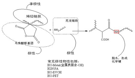 馬來酸酐接枝聚合物中,酸酐基團在高溫和螺桿剪切作用下和極性基團(-NH2,-OH)發生廣義脫水反應,形成化學鍵,從而將不相容的極性、非極性物質化學偶聯。