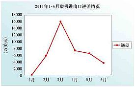 2011年1-6月中國(guó)塑料加工設(shè)備進(jìn)出口逆差走勢(shì),由圖可知,3月創(chuàng)上半年中國(guó)塑機(jī)逆差最大值,而1月最小