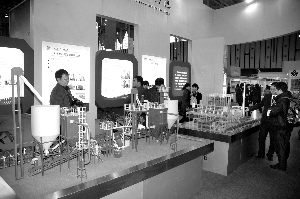 江蘇科行集團在國家“863”項目研究成果的基礎上,對選擇性催化還原(SCR)脫硝催化劑原料配方進行優化,并將預處理技術和半干法壓制技術相結合,研發出TZ型板式SCR催化劑制備技術。該技術在保證脫硝性能的前提下,有效降低了系統投資和運行成本,目前已在國內外化工、鋼鐵、電力等行業得到廣泛應用。圖為在上周南京舉辦的國際環保產業博覽會上,科行集團參展的SCR煙氣脫技術模型。