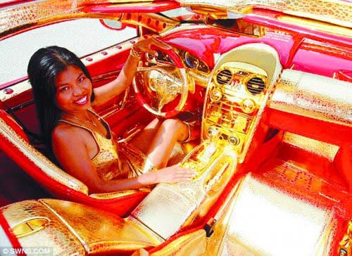 據英國《每日郵報》12月9日報道,這輛跑車外部涂有25層鮮紅的油漆,涂料中混有5公斤的金粉,同時它的前大燈、車門四周以及車輪等部分鍍上了24K純金。汽車內部鑲有600多顆紅寶石,價值30萬英鎊(約合人民幣297萬元)。整個改裝耗資350萬英鎊(約合人民幣3472萬元)。