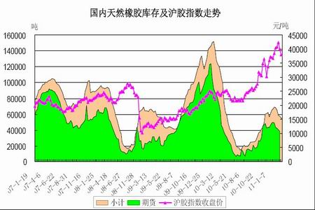 圖為國內天然橡膠庫存及滬膠指數走勢圖。(圖片來源:魯證期貨)