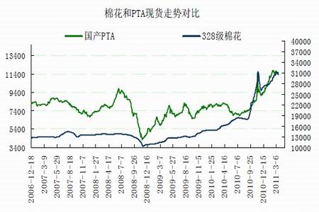 從圖十二、十三的價格對比中我們可以發現:同為紡織服裝原料的棉花,2010年價格從年初的14000附近上漲至28000以上,價格已經翻了一倍以上,作為紡織原料替代品的滌綸短纖,2010年年初的價格10000附近上漲至14000,漲幅僅40%。.如果僅從棉花比價效應看,PTA仍有較大的補漲空間。