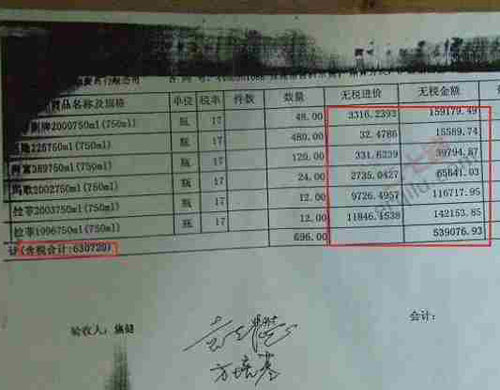 網上所公布的多張發票復印件顯示,此次被曝光的企業是“中國石油化工股份有限公司廣東石油分公司”,所進酒水多為“拉菲”等名貴洋酒及高價茅臺酒。其中,僅一瓶拉菲1996(750ml)的無稅進價就高達11846元。另一張貴州茅臺酒銷售有限公司所開的發票顯示,中石化廣東分公司一次性購買了近82萬元的茅臺酒。