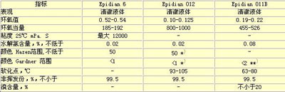該工藝可以生產多種高性能的環氧樹脂。專家編制了下表,列出了Epidian6、Epidian012、Epidian011B3種樹脂的典型參數: