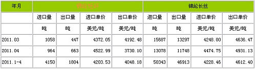 從我國(guó)錦綸纖維不同品種的進(jìn)出口情況看,2011年1-4月份錦綸纖維短纖進(jìn)口0.41萬(wàn)噸,進(jìn)口單價(jià)4203.53美元/噸;出口0.18萬(wàn)噸,出口單價(jià)4048.18美元/噸;錦綸纖維長(zhǎng)絲進(jìn)口5.03萬(wàn)噸,進(jìn)口單價(jià)4228.46美元/噸;出口4.69萬(wàn)噸,出口單價(jià)4612.40美元/噸;表明我國(guó)錦綸纖維短纖和長(zhǎng)絲進(jìn)出口狀況良好。
