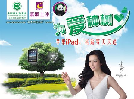 李冰冰是WWF(世界自然基金會)“EarthHour(地球一小時)”中國區推廣大使、澳大利亞環保機構“最具行動力大使”、國際氣候組織“百萬森林”項目亞太區推廣大使、NGO(公益環保組織)世界自然基金會全球大使,為中國乃至世界的低碳環保事業做出了突出的貢獻。嘉麗士作為一個有責任的企業,把“善待·和諧”作為企業的發展理念,在產品的生產中爭做行業最低碳環保的企業,在產品的研發上也貫穿了這種理念,并成功研發出樂活 26度等系列低碳產品。此外,嘉麗士還相繼推出了一系列大型的低碳環保公益活動:2009年推出“樂活種樹低碳生活”;2010年啟動“善待環境關愛大熊貓”活動;2011年先后發起“地球熄燈一小時”“為愛種樹”大型公益活動,目前嘉麗士公益活動已帶動無數環保人士參與其中。