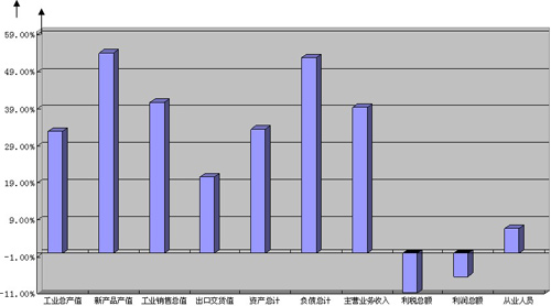 一、以500萬(wàn)年銷售值標(biāo)準(zhǔn)計(jì)算,有46家,其中非會(huì)員企業(yè)4家,占8.69%。工業(yè)總產(chǎn)值占101家統(tǒng)計(jì)的92.27%、新產(chǎn)品產(chǎn)值占101家統(tǒng)計(jì)的100.00%、工業(yè)銷售值占101家統(tǒng)計(jì)的93.76%、出口交貨值占101家統(tǒng)計(jì)的100.00%%、資產(chǎn)總計(jì)占101家統(tǒng)計(jì)的 95.38%%、負(fù)債總計(jì)占101家統(tǒng)計(jì)的96.81%%、主營(yíng)業(yè)務(wù)占101家統(tǒng)計(jì)的94.22%%、利稅總額占101家統(tǒng)計(jì)的95.07%%、利潤(rùn)總額占101家統(tǒng)計(jì)的94.33%%、從業(yè)人員占101家統(tǒng)計(jì)的82.37%。由此可見,46家500萬(wàn)以上產(chǎn)值的企業(yè)控制了101家企業(yè)主要指標(biāo)的全部和絕對(duì)大部。