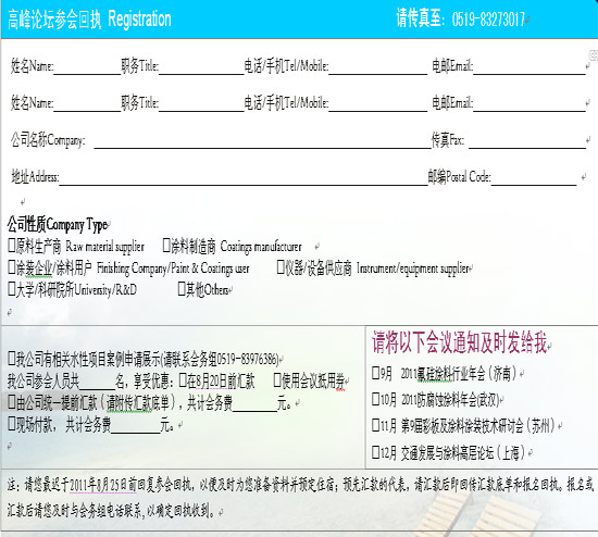 優惠:凡持有“2011年《涂料工業》專業會議抵用券”的代表,憑券抵會議注冊費200元(每位代表可抵用1張)。請在匯款前與會務組核實,并在匯款后將匯款底單和抵用券與回執表一起傳真,并務必在現場報到時帶上抵用券原件交至會務組,使優惠生效。