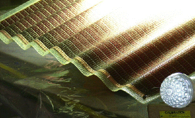 采用這種技術,屋面安裝工可從地上或卡車上把大塊的波形板吊上屋頂,就像普通波形屋面板那樣用螺絲把它們固定到椽木上,然后從每塊板把電線接到一轉換器,使建筑物的絕大部分屋面形成一個大的太陽能板。