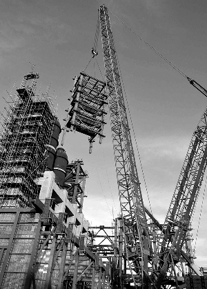 福建漳州騰龍化工項目芳烴聯合裝置工程連續重整裝置反再框架自九月十六日開始吊裝對接,在一周內完成全部七組的吊裝對接施工,標志著聯合裝置工程大型設備吊裝安裝開始進入高潮。該工程由中石化四建承擔建設。圖為設備吊裝現場。