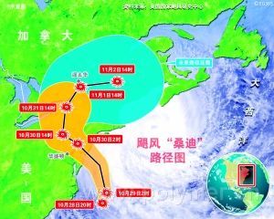 颶風“桑迪”10月28日沿美國東海岸北上,當地時間29日晚8點(北京時間30日上午8點)在大西洋城登陸,風速達80英里/時。氣象部門預報,“桑迪”將與來自西部的冬季風暴和來自北部的冷空氣匯合,形成“超級”風暴,影響范圍從東海岸至五大湖地區,跨度大約為1300千米。