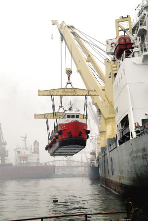 在9艘工程船中,“海豹·二號”是最重的一艘,“體重”達到280噸,為了順利把它吊上“大華”號,天津港二公司選派了經驗最豐富的作業工人,并由生產經理親自上到“大華”號的甲板監督作業。記者看到,“海豹·二號”從海面上緩緩升起,越升越高,很快就超過了“大華”號甲板的高度。