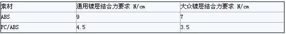 表1主機廠對電鍍ABS和PC/ABS材料鍍層結合力要求