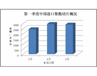 第一季度,中國累計進口聚酯切片4.8萬噸,金額8400萬美元,與去年同期相比,分別增長16.8%和15%。其中,2月為第一季度出口高峰,進口金額達2964萬美元,而1月為進口低谷,進口金額約2446萬美元。