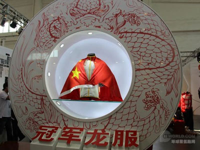 活動中,國家體育總局局長助理曉敏與安踏體育用品有限公司董事局主席兼首席執行官丁世忠共同揭開了展館舞臺中心的龍盤帷幕,倫敦奧運會中國代表團領獎服——“冠軍龍服”身披國旗亮相。
