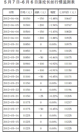 從上下游行情綜合來看,上游原料價格的下跌直接影響了滌綸長絲的市場行情,使滌綸長絲的市場行情不能依靠上游原料來獲得支撐,而下游也沒有支持,因此6月以來,滌綸長絲價格出現了連續下跌的現象(5月7日~6月6日滌綸長絲行情監測表)。