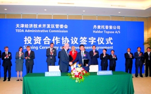 9月11日,夏季達沃斯論壇期間,天津濱海新區開發區(南港工業區)管委會與丹麥托普索公司在天津簽署了投資合作協議。丹麥首相托寧·施密特女士、天津市長黃興國、丹麥駐華大使裴德盛、天津市副市長任學鋒等出席簽字儀式。根據協議,托普索公司將在天津南港工業區設立中國北方高性能催化劑項目基地,項目總投資2億美元,一期工程主要生產柴油發動機尾氣脫硝催化劑。 圖為南港工業區與托普索公司投資合作協議簽字儀式現場。