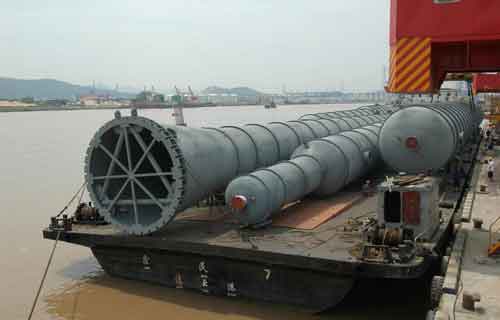 7月24日長60余米重134噸的重組份脫除塔駁運在鎮海大件碼頭裝運上船
