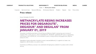 寰峰浗璧㈠垱鍏徃(Evonik)瀹e竷錛屼簬2019騫?鏈?鏃ヨ搗寮濮嬭皟楂樺叾鐢插熀涓欑儻閰告爲鑴備駭鍝佺郴鍒椾環鏍鹼紝娑ㄥ箙鑷沖皯10%錛岄儴鍒嗕駭鍝佹定騫呰揪鍒?0% 鈥?25%銆?/span>