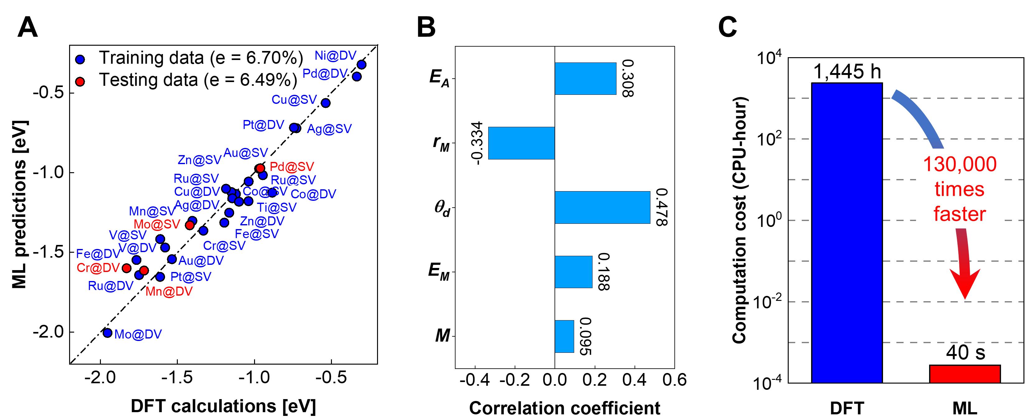 鏈枃鍩轟簬鎷撴墤緇撴瀯鐨勬満鍣ㄥ涔犳柟娉曚笉浠呭皢閲戝睘鍘熷瓙鍛ㄥ洿緇撴瀯淇℃伅浣滀負杈撳叆鏁版嵁錛岃繕寮曞叆涓嶰ER鍌寲鎬ц兘鐩稿叧鐨勪簲涓弬鏁幫紙閲戝睘鍏冪礌鐨勮川閲忥紝鍗婂緞錛宒杞ㄩ亾鐢靛瓙涔︼紝鐢佃礋鎬э紝鐢靛瓙浜插拰鑳藉拰絎竴鐢電鑳斤紝鍥?B錛夊妯″瀷榪涜棰勬祴錛岄嫻嬭宸簿搴︿負6.49 % 錛堝浘3A錛夈傛湰鐮旂┒鎻愬嚭鐨勫熀浜庢満鍣ㄥ涔犳柟娉曠殑鍗曞師瀛愬偓鍖栧墏棰勬祴鏂規硶錛岃兘澶熷ぇ騫呭湴鎻愰珮鍌寲鍓傜殑絳涢夐熷害銆傚叿浣撳湴錛屽湪 40 鏍稿績鐨勮秴綆椾笂榪涜 DFT 璁$畻錛屾瘡縐嶅厓绱犵殑 ORR 鍌寲媧繪х‘瀹氶渶瑕佸ぇ姒?6涓皬鏃躲傝屽熀浜庢満鍣ㄥ涔犵殑鏂規硶鍖呮嫭璁粌鍜岄嫻嬪叡14縐嶅厓绱犳葷敤鏃剁害40縐掞紝騫朵笖鍙湪瀹剁敤絎旇鏈數鑴戜笂榪涜銆傚偓鍖栧墏鐨勭瓫閫夐熺巼鎻愰珮浜嗙害 130,000 鍊嶏紙鍥?C錛夈?br />