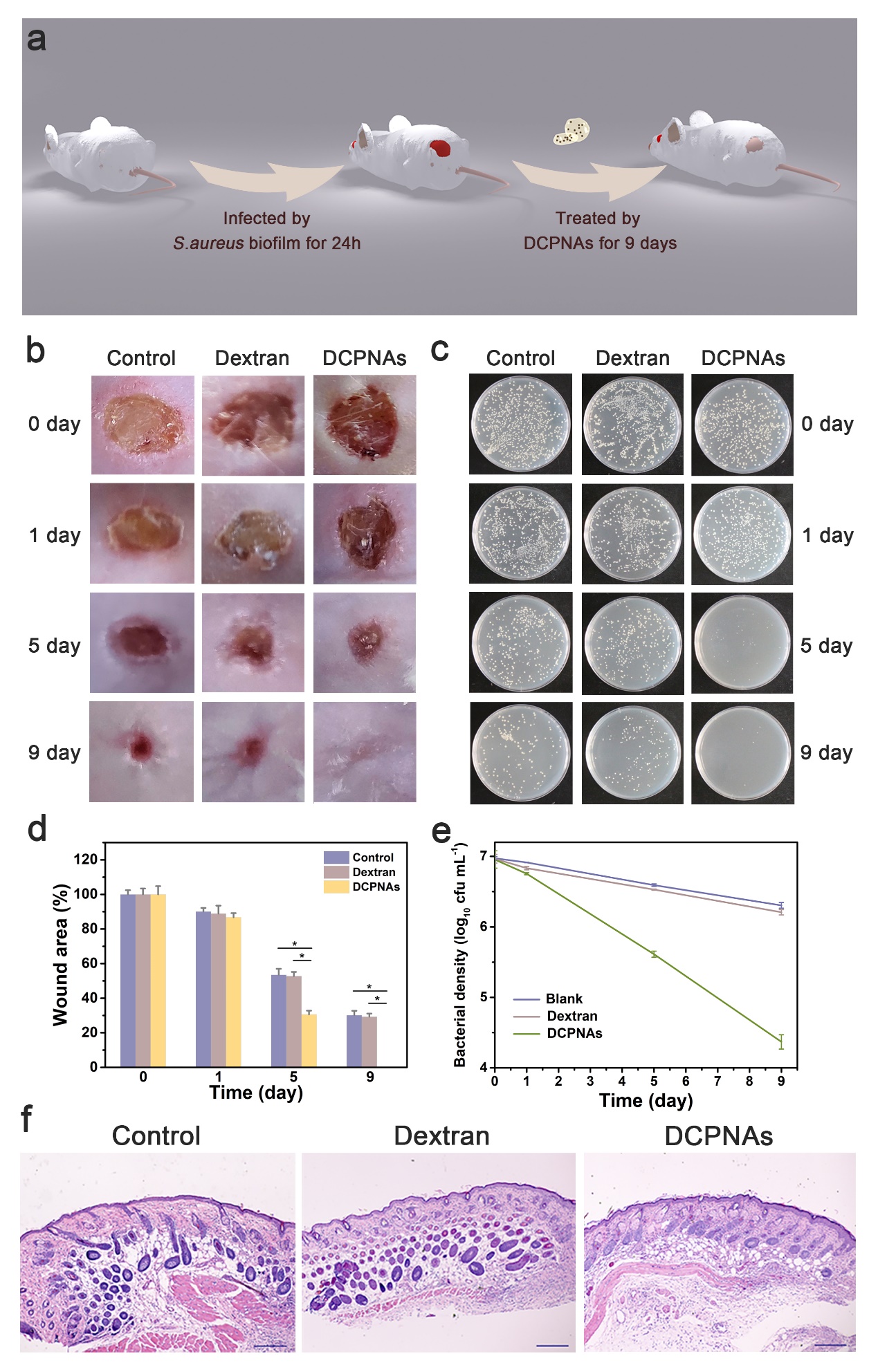 Figure 4. DCPNAs鍦ㄦ不鐤楃粏鑿屾劅鏌撴у垱闈腑鐨勫簲鐢ㄨ瘯楠岀粨鏋滐細(a) DCPNAs澶勭悊浼ゅ彛鍒涢潰紺烘剰鍥撅紱(b) 鍚勭粍浼ゅ彛鍒涢潰鍙樺寲鍥撅紱(c) DCPNAs瀵逛激鍙h〃闈㈢粏鑿岀殑鎶楄弻鏁堟灉鍥撅紱(d) 鍚勭粍浼ゅ彛闈㈢Н闅忔椂闂村彉鍖栫洿鏂瑰浘(* P <0.05)錛?/span>(e) DCPNA瀵逛激鍙h〃闈㈢粏鑿岀殑鎶楄弻鏁堟灉錛?/span>(f) 娌葷枟9 d鏃跺悇緇勭殑灝忛紶浼ゅ彛緇勭粐鐨?/span>H&E鏌撹壊鍒囩墖緇撴灉