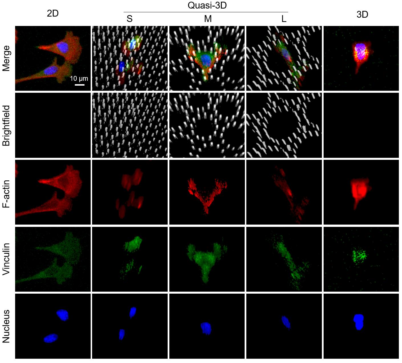 鍥?/span>8. 鍏辮仛鐒︽樉寰暅Z杞村眰鎵殑涓夌淮鍙犲姞鍥俱傚叾涓伆鑹茶〃紺烘潗鏂欙紱綰㈣壊琛ㄧず寰笣錛涚豢鑹茶〃紺洪粡鐫鏂戣泲鐧斤紱钃濊壊琛ㄧず緇嗚優鏍搞傛澶勶紝鈥?D鈥?/span>琛ㄧず騫沖潶 PDMS 琛ㄩ潰涓婄殑緇嗚優錛?/span>鈥?D鈥?/span>琛ㄧず鍩鴻川鑳朵腑鐨勭粏鑳烇紝鈥?/span>quasi-3D鈥?/span>琛ㄧず琚?/span>PDMS寰煴鍖呭洿鐨勫井浜曚腑鐨勭粏鑳烇紝鍏朵腑鈥淪鈥?/span>銆?/span>鈥淢鈥?/span>鍜?/span>鈥淟鈥?/span>琛ㄧず灝忋佷腑銆佸ぇ寰簳銆?/span> 緇嗚優鍦?/span>浜岀淮鍜屽噯涓夌淮涓煿鍏?/span>4 h錛屽湪涓夌淮涓煿鍏?/span>24 h銆?/span> 涓轟簡鑰冨療涓嶅悓緇嗚優瀵逛簬涓夌寰幆澧冪殑鍝嶅簲錛屽皢涓夌緇嗚優鍦ㄤ簩緇淬佸噯涓夌淮鍜屼笁緇村井鐜涓?/span>鐨勭粏鑳炲搷搴斻傝繖涓夌緇嗚優鍒嗗埆涓?/span>hMSC錛堜漢楠ㄩ珦闂村厖璐ㄥ共緇嗚優錛?/span>銆?/span>HFF錛堜漢鍖呯毊鎴愮氦緇寸粏鑳烇級銆?/span>HUVEC錛堜漢鑴愰潤鑴夊唴鐨粏鑳烇級銆傞渶瑕佸己璋冪殑鏄紝榪欓噷騫?/span>娌℃湁鍔ㄧ敤寰幆鎷変幾銆傚浘9A鎵紺猴紝緇嗚優鍦ㄤ簩緇?/span>寰幆澧冧腑4 h鍐?/span>灝遍摵灞?/span>鑹ソ銆備絾鍦ㄤ笁緇?/span>寰幆澧?/span>涓?/span>灝界鍩瑰吇24 h錛岀粏鑳?/span>浠嶇劧鍦ㄥ熀璐ㄨ兌涓秼浜庡渾褰€傚湪鍑嗕笁緇?/span>寰幆澧?/span>涓紝緇嗚優琛ㄧ幇鍑轟笉鍚岀殑褰㈡侊細M浣跨粏鑳炴瘮S鍜?/span>L鑶滄洿鍦嗐傚浘9B鏄劇ず浜嗗畾閲忓垎鏋愮殑緇撴灉銆傚渾搴︾‘瀹炴槸浜岀淮<鍑?/span>涓夌淮<涓夌淮銆傛澶栵紝姣忎釜緇嗚優涓?/span>榛忕潃鏂戣泲鐧?/span>鐨勭Н鍒嗗己搴︿負浜岀淮: 鍑嗕笁緇?/span>:涓夌淮= 5:3:1銆傚洜姝わ紝鍑嗕笁緇村井鐜浠嬩簬浜岀淮鍜屼笁緇翠箣闂達紝涓?/span>鐩稿鏇存帴榪戜笁緇淬傚湪鍑嗕笁緇達紙S銆?/span>M 鍜?L錛変腑錛?/span>M緇勫湪鎵鏈変笁綾葷粏鑳炵殑涓変釜鏂歸潰錛?/span>寰笣銆佸渾搴﹀拰緇嗚優闈㈢Н錛夊潎鏄劇ず鍑烘渶楂樺箋?/span>