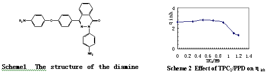 DAPE+TPC2時,改變TPC1/PPD的量,對聚合物的特性粘度、反應合成規律、尤其是助溶劑鹽LiCl用量、聚芳酰胺熱穩定性能、溶解性能和力學性能等都產生不同程度影響。Scheme2列出了TPC1/PPD對于ηinh值的影響。通過研究,可進行分子結構設計、聚合物序列以及聚合物分子量的控制。![]() |