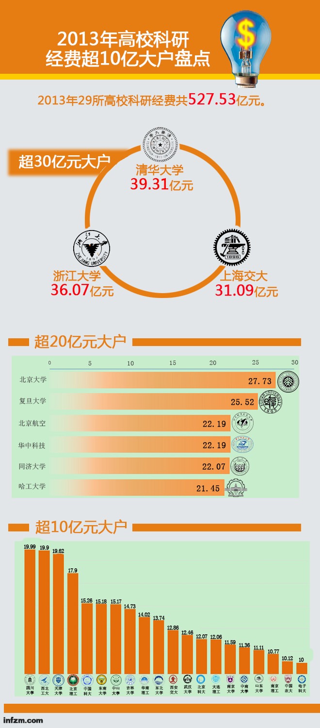 2013年高校科研經費超過10億元共有29所高校,其中,清華大學以39.31億元的科研經費排名第一,浙江大學和上海交通大學緊跟其后,分別是36.07億元和31.09億元。科研經費超過30億元的共有3所大學,20-30億元的共有6所大學,10-20億元的共有20所大學。