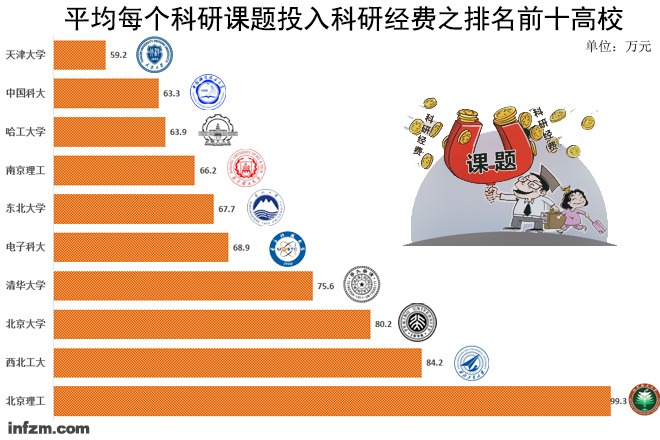在2013年科研經費超10億元的29所高校中,科研經費總額達527.53億元,科研課題總數11.44萬個,平均每個科研課題投入科研經費46.9萬元。其中,北京理工大學排名第一,科研經費17.9億元,科研課題總數1803個,平均每個科研課題投入99.3萬元科研經費,西北工大84.2萬元和北京大學80.2萬元分別排名第二第三。