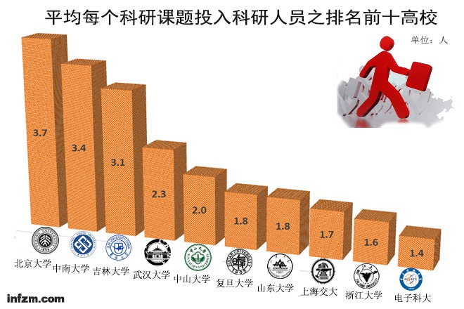 在2013年科研經費超10億元的29所高校中,科研課題總數11.44萬個,教學和科研人員數達16.47萬人,平均每個科研課題投入科研人員1.44人。其中,北京大學投入人員最多,科研課題總數3458個,科研人員12815人,平均3.7個科研人員負責1個科研課題,中南大學排名第二(3.4人/課題),吉林大學第三(3.1人/課題)。