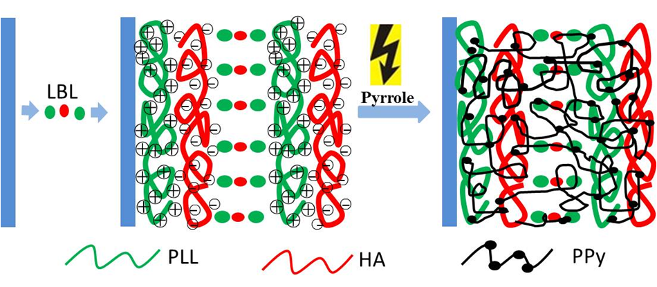 3、導電水凝膠薄膜能夠為生物材料界面提供更為豐富的功能。本課題研究利用吡咯在水凝膠薄膜中原位電聚合,在提高水凝膠的力學穩定性的同時,實現亞微米級的導電水凝膠界面。該體系潛在的能夠成為基于電化學的生物材料平臺,應用于神經細胞調控、生物電傳感等領域。相關論文“Thin electroconductive hydrogel films by in situ electropolymerization of pyrrole within polyelectrolyte multilayers”發表在國際期刊RSC Advances(2014,4(47),24511-24517),影響因子3.708。