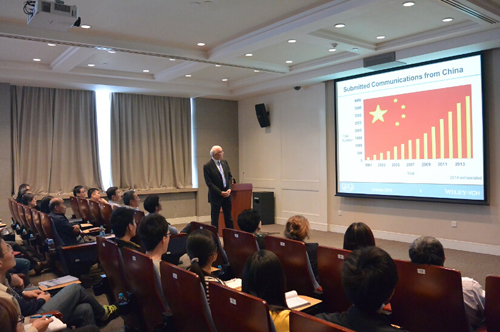 在報告會上,Peter Goelitz先生首先簡單介紹了《應用化學》(Angewwandte Chemie)期刊創刊以來的發展歷史與期刊影響力,強調了中國科研工作者近十多年來在該期刊發表的高質量論文逐年增長(2001年,不到200篇;2013年,約3500篇)。Peter先生將期刊的成功歸因于積極投稿的科研工作者、期刊編輯團隊以及期刊倡導的不斷進取的創新力,期待我國科研工作者繼續努力,積極為期刊投稿,貢獻出更多有價值的科研成果。