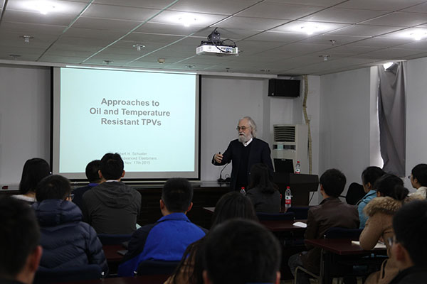 在報告中Schuster教授詳細介紹了由多種極性橡膠和極性塑料(如聚酰胺)合成的耐油性TPVs的開發和其特殊的加工特性。自1960年開始,熱塑性硫化膠在工業應用和基礎研究受到了廣泛的關注。然而,由非極性聚合物制得的TPVs不具有耐油性,并且不能用于制備在較高溫度下工作的零部件。此外Schuster教授還介紹了一類新的具有穩定形態、優越的耐油性和機械性能的橡膠/塑料混合物,以及它們的制備方法。Schuster教授風趣幽默,講解細致易懂,與師生們進行了廣泛的討論。在訪問期間,張立群教授和王文才教授還與Schuster教授以及中國橡膠工業協會的同事一起洽談了共同舉辦2016年國際彈性體論壇(ISE2016)的具體事宜,該國際會議將首次于明年6月份在我國的山東青島舉辦,將是國際橡膠彈性體領域的一次盛會。