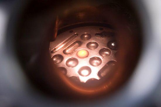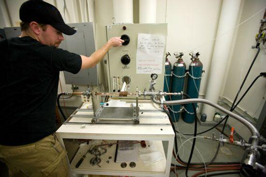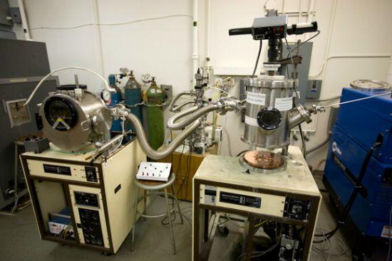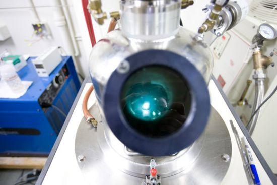 接下來,裝有實驗樣本的玻璃真空管和銅底座槽必須抽盡空氣,并注入氬惰性氣體(圖上墻角放置的藍色瓶),這將避免實驗樣本被氧化。最后,霍夫曼手動轉動無線電頻率感應器的刻度,對銅底座槽上的實驗樣本加熱800-1000攝氏度。