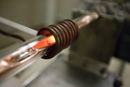 無線電頻率感應器提供200伏特、50安培的電流通過螺旋管,通過感應作用加熱實驗樣本。這個螺旋管自身并不會變熱,但是實驗樣本會明顯發熱。在加熱溫度超過電弧熔化機時,無線電頻率感應器將提供更多的控制,使科學家可以調整合金詳細的成分比例。