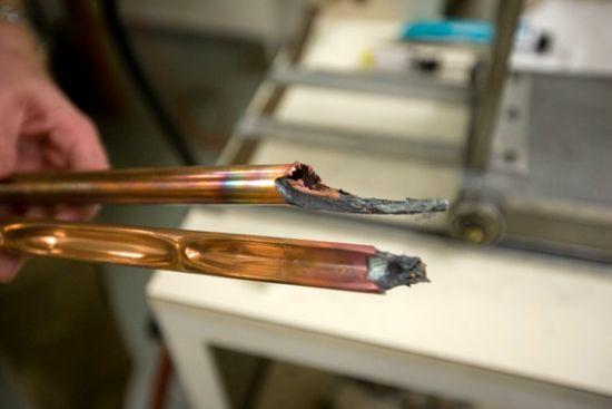當一位學生操作失誤在實驗時忘記開啟冷卻閥,銅底座槽由于溫度過熱出現了破裂,銅比其他制造合金的金屬擁有更低的熔點,但是由于它有較高等級的導熱性,能夠將熱量傳遞在水中。在實驗中需要經常更換銅底座槽中的水。