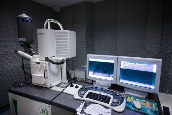 掃描電子顯微鏡正在對實驗樣本表層結構進行詳細拍照,其中就包括由霍夫曼創建的合成金屬玻璃材料。