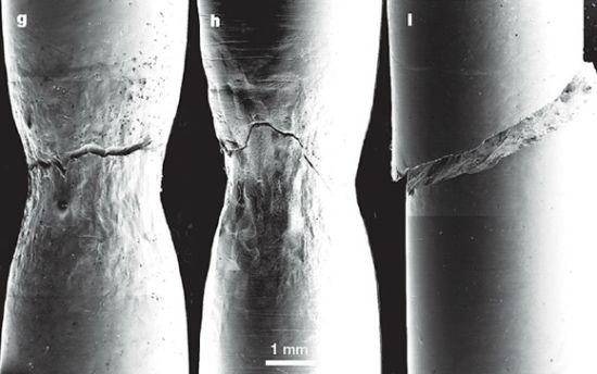 顯微鏡圖片顯示水晶枝狀結晶如何影響合成金屬的壓力形成,左側圖片是實驗樣本結合小比例枝狀結晶,中部圖片是高比例枝狀結晶,右側圖片是沒有枝狀結晶的純金屬玻璃。
