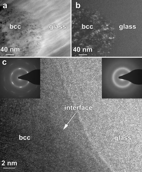 電子顯微鏡顯示,水晶枝狀結晶和玻璃結構的實驗樣本,水晶枝狀結晶在圖中被標注為“bcc”,其圓心位置有立方體結構。從而可以對比左上圖水晶枝狀結晶中有序幾何矩陣原子和右上圖玻璃結構中隨機分子排列。