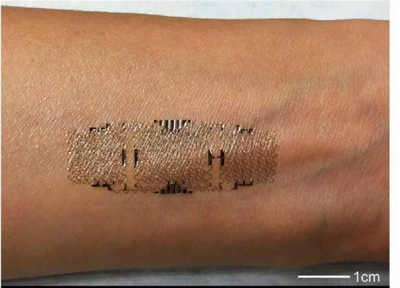 下圖展示了現有技術中存在的電子皮膚,其既能夠像薄如蟬翼的薄膜一樣貼附在人體皮膚表面,也能夠附著于可彎曲的基底材料上實現相關參數檢測。