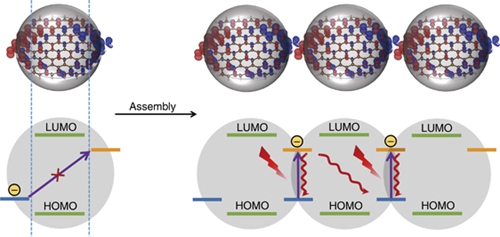 碳納米點具有發光性能優異、水溶性好、生物相容性高、低成本、易修飾等諸多優點,在生物醫療領域展現了獨有的優勢和應用前景。然而,由于缺少有效的能帶調控手段,現有的碳納米點光學吸收主要集中在紫外到藍光波段,吸收帶拖尾延伸至近紅外區,導致其在近紅外區的光吸收系數很低,這嚴重限制了其在長波長波段,特別是生物組織光學窗口的實際應用。針對這一難題,曲松楠課題組通過控制表面電荷分布不均的碳納米點的組裝,獲得了可見-近紅外區具有強吸收峰(λmax = 700 nm)和高光熱轉換效率(53%)的超碳納米點組裝體。該超碳納米點組裝體內,相鄰的碳納米點組裝單元通過可能的靜電相互作用和氫鍵形成組裝體,從而實現組裝單元間表面能級的空間交疊和電荷轉移,在可見-近紅外區形成了獨立的強吸收峰。該類超碳納米點具有良好的生物相容性,有潛力作為近紅外光熱治療試劑應用于腫瘤光熱治療。該工作不但獲得了長波長吸收的碳納米點,更為碳納米點光物理性能的調控提供了新的方法和思路。