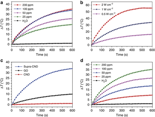 (d)808 nm,1 W cm-2 激光輻照下不同濃度超碳納米點溶液升溫-時間曲線。