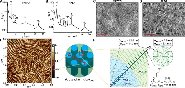 輕敲模式下32TG的AFM相圖以及部分32TEG或32TG圓柱體橫截面的圖示,其中有三個(gè)獨(dú)特的維度:圓柱的間距d,聚合物骨架間距α和單體殘留物長度β