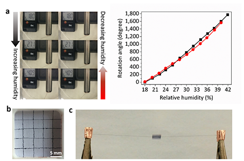 圖3 (a) 復合纖維對環(huán)境濕度的響應; (b) 復合纖維編織物; (c) 在幅值10 mA, 周期 ~ 1 s的脈沖電流激勵下發(fā)生電致動。