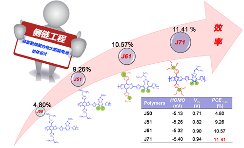 中科院化學所有機固體院重點實驗室研究人員發展了一系列基于噻吩取代苯并二噻吩(BDTT)與苯并三氮唑(BTA)單元的中間帶隙二維共軛聚合物給體材料,通過側鏈工程降低了HOMO能級,增強了鏈間相互作用,提高了空穴遷移率。使基于這類聚合物為給體、ITIC為受體的非富勒烯聚合物太陽能電池的能量轉換效率達到11.4%。